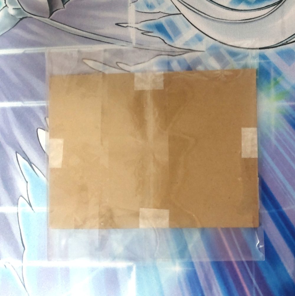 その後、トレカ用の段ボールでローダーをしっかり挟み込み、四方をセロテープで固定。カードが動かない状態にして完成です。あとは袋に入れて防水対策を行い、しっかりと固定をして封筒に入れる流れになります。